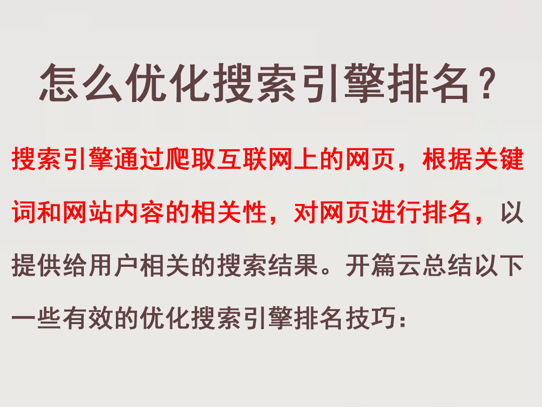 搜索引擎通過爬取互聯網上的網頁,根據關鍵詞和網站內容的相關性,對網頁進行排名,以提供給用戶相關的搜索結果。因此,優化搜索引擎排名的方式主要是通過優化網站的內容和結構,以及合理使用關鍵詞來實現。開篇云總結以下一些有效的優化搜索引擎排名技巧: